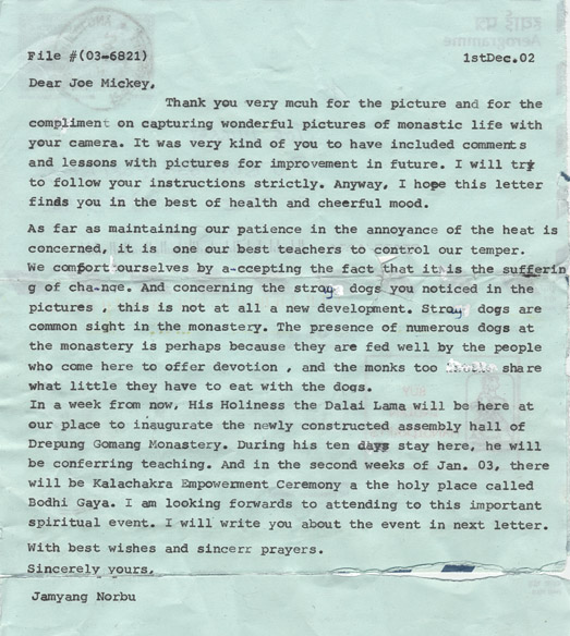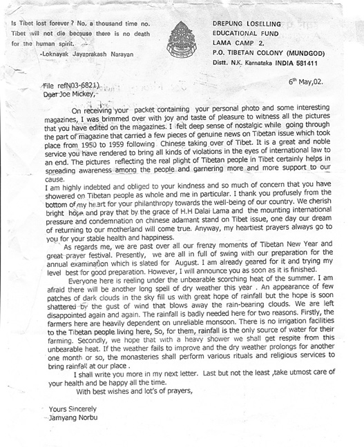 recent letter, dated May 6, from Jam Yang Norbu who lives at the